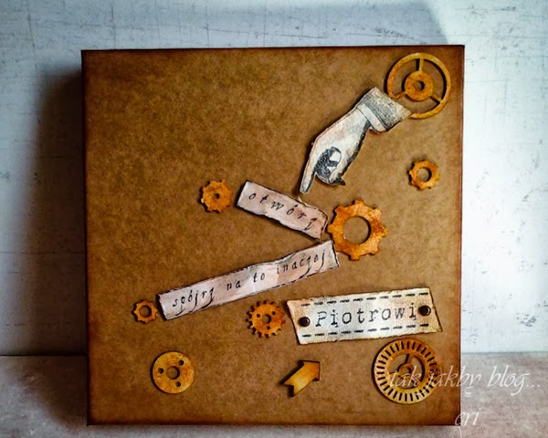 Po przemyśleniu opcji, wzięciu pod uwagę osobę ofiarowywaną - czyli pewnego pana - w głowie powstał mi projekt, który musiałam zrealizować...no nie miał wyboru, zaistnieć musiał fizycznie :) Bazą musiał być karton, ciemny - idealne były bazy Papierowej Galanterii, jak i odpowiednie, również Galanteryjne pudełeczko...a później cała reszta - to musiały być papiery UHKowe :) i tak..poszarpałam My Dear Watson, dodałam trochę Gaju Oliwnego i zmiksowałam z Le Journal... I Namastowy papier - był bazą do wydruków wszelakich, łącznie ze stempelkami od Novinki - podejrzewam, iż sama zacznę odświeżać swoje umiejętności w digi i może jakiś tekst/stempel powstanie ;) tym razem spodobały się mi te właśnie, konkretne..pasowały do ogólnego charakteru pracy - a miała być steampunkowa :) i mam nadzieję, iż się to udało..powstał trochę jakby rusty steampunk ;) i sprawił mi ogromną frajdę urealniając się..Wsparły zamierzenia świetne trybiki i ramki od Stempell&Kartoon, trochę/dużo szarpania, distressów i cracle od Tima Holtza..całość podobała się bardzo, choć zapewne zdjęcia tego nie oddadzą - pstrykacz taki-sobie ;) Efektem - komplet, kartki-pudełka, pudełka na kartkę pudełko;) i dwóch tagów, tak ku radości życzeń ;) zaś zdjęcia...trochę ich będzie, nie mogłam się powstrzymać ;)